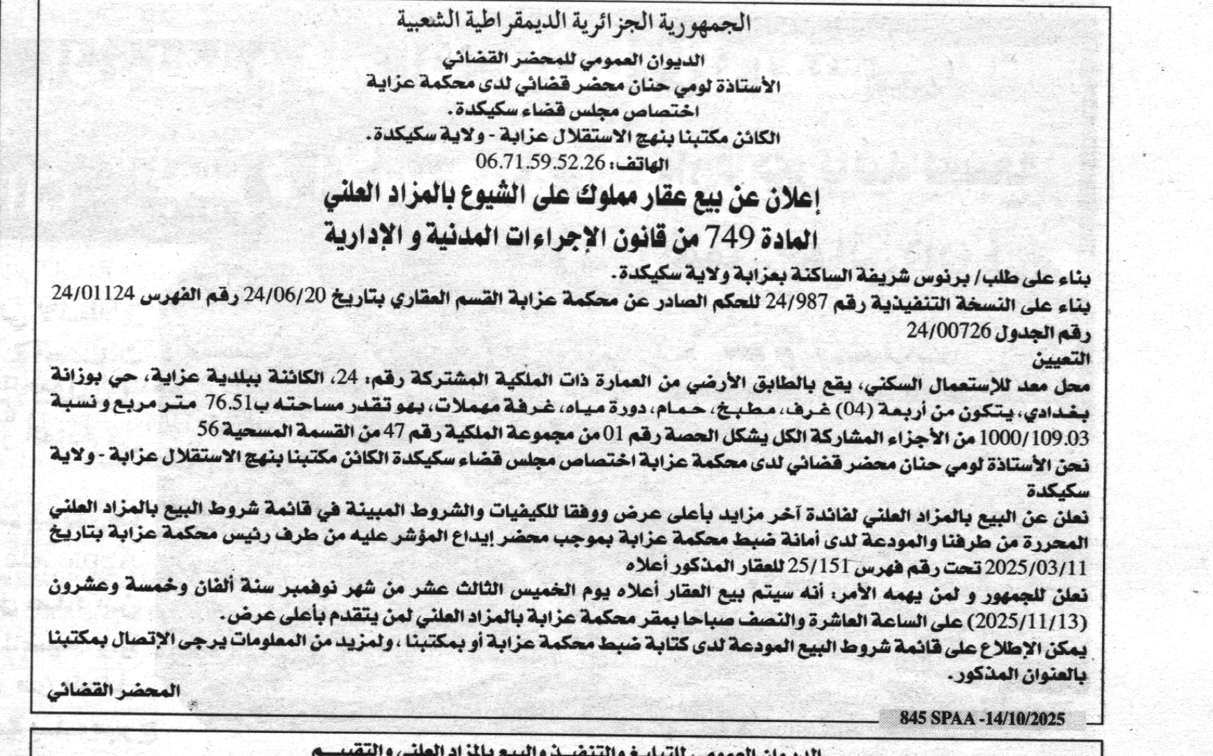 Il sera procédé à la vente au plus offrant et dernier enchérisseur le :
