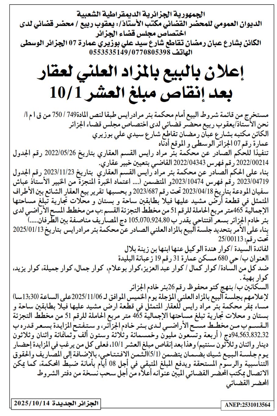 Il sera procédé à la vente au plus offrant et dernier enchérisseur le :