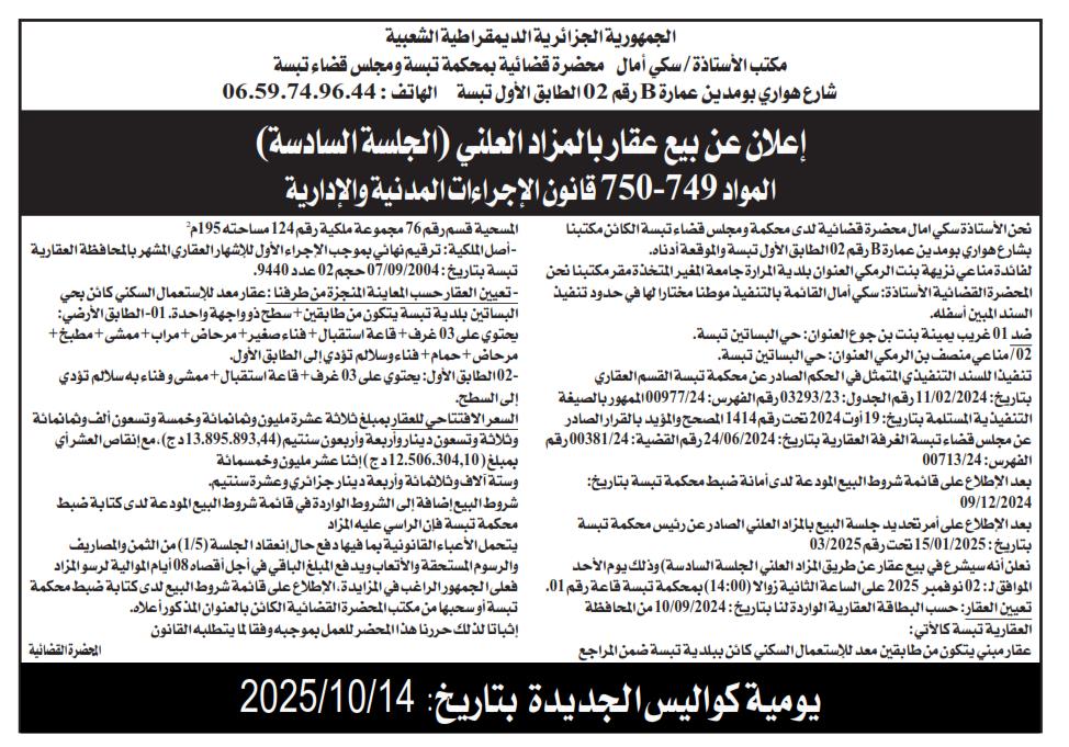 Il sera procédé à la vente au plus offrant et dernier enchérisseur le :