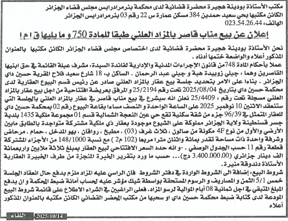 Il sera procédé à la vente au plus offrant et dernier enchérisseur le :