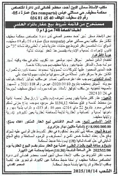 Il sera procédé à la vente au plus offrant et dernier enchérisseur le :