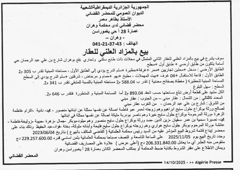 Il sera procédé à la vente au plus offrant et dernier enchérisseur le : 05/11/2025';