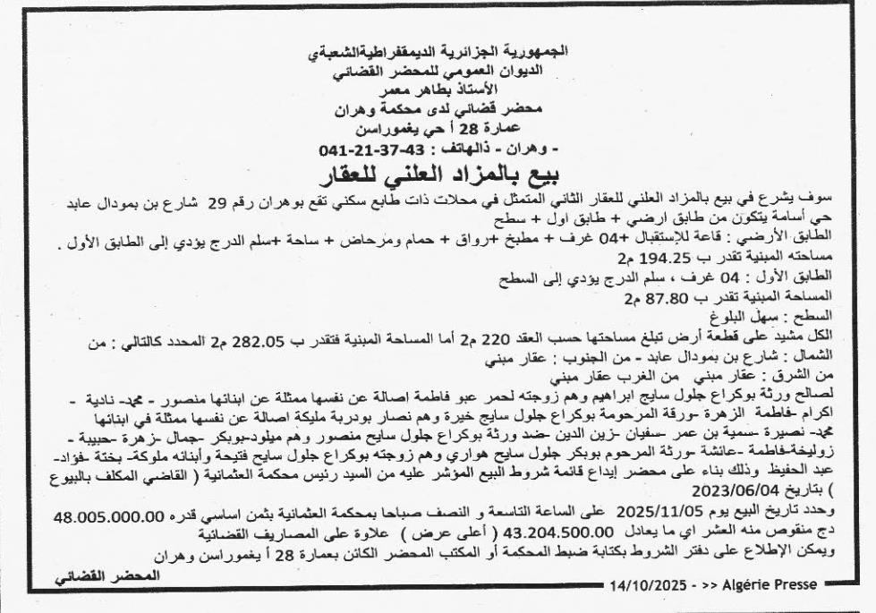 Il sera procédé à la vente au plus offrant et dernier enchérisseur le :