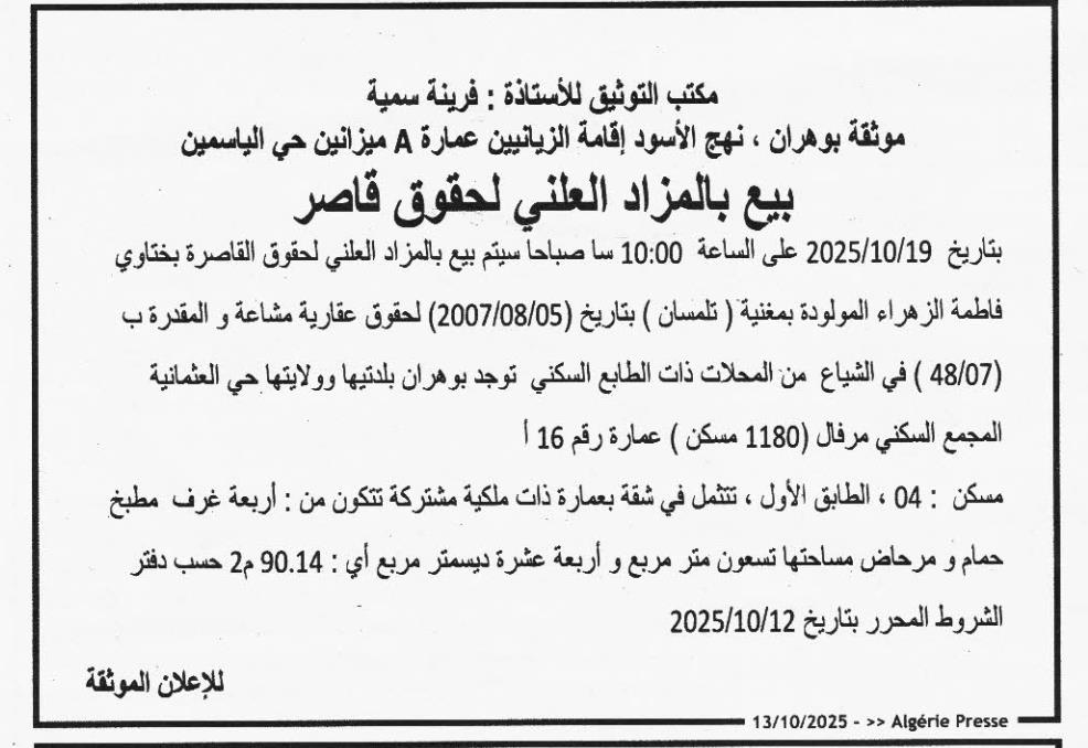 Il sera procédé à la vente au plus offrant et dernier enchérisseur le :
