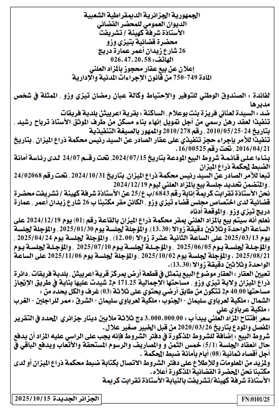 Il sera procédé à la vente au plus offrant et dernier enchérisseur le :