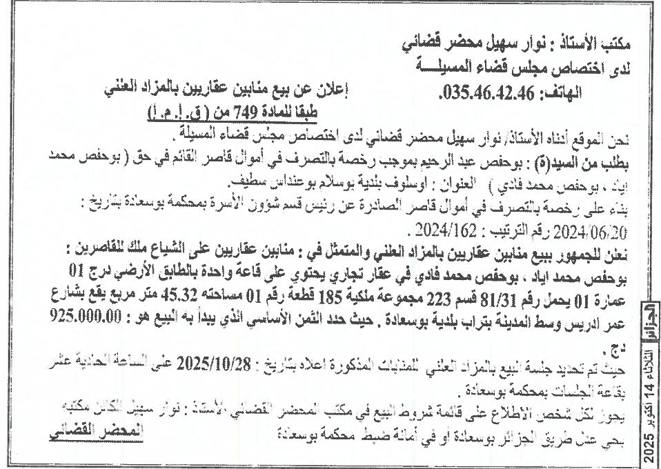 Il sera procédé à la vente au plus offrant et dernier enchérisseur le : 28/10/2025';