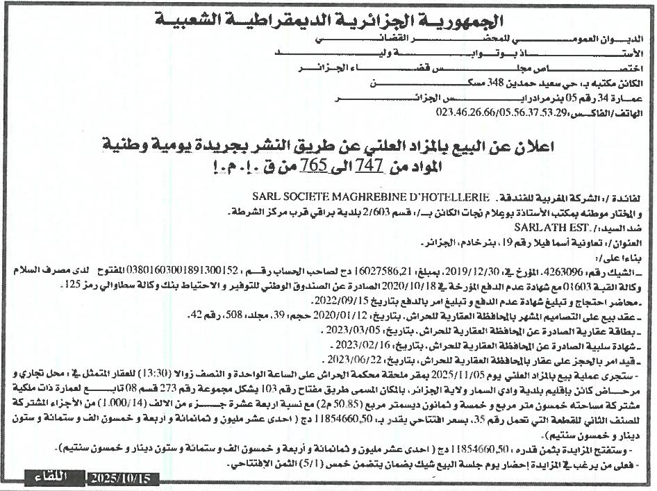 Il sera procédé à la vente au plus offrant et dernier enchérisseur le :