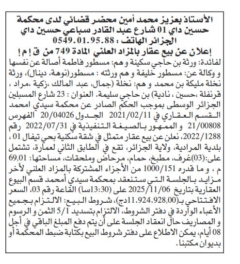 Il sera procédé à la vente au plus offrant et dernier enchérisseur le :