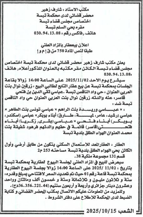 Il sera procédé à la vente au plus offrant et dernier enchérisseur le :
