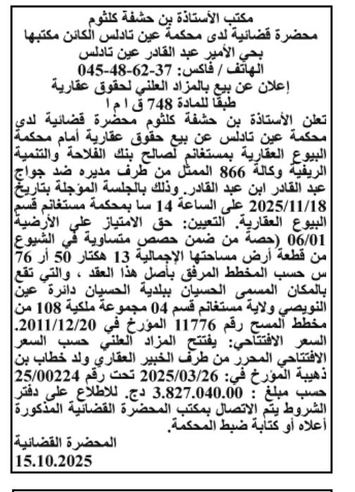 Il sera procédé à la vente au plus offrant et dernier enchérisseur le : 18/11/2025';