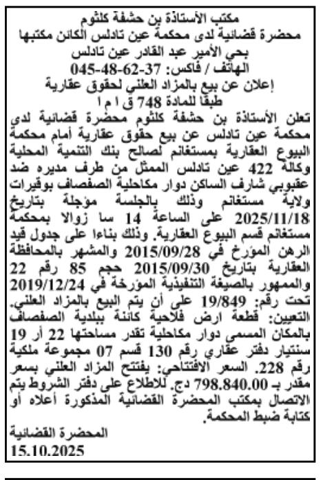 Il sera procédé à la vente au plus offrant et dernier enchérisseur le :