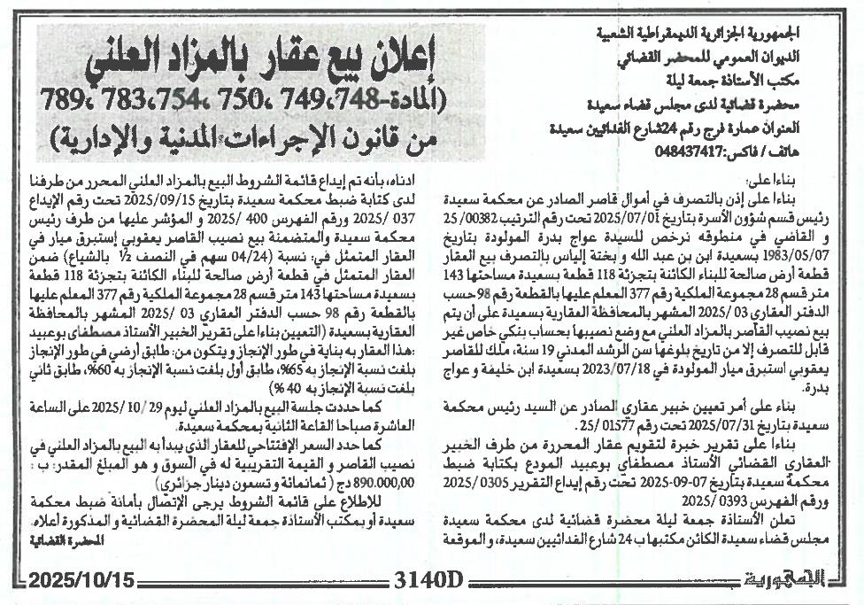 Il sera procédé à la vente au plus offrant et dernier enchérisseur le :