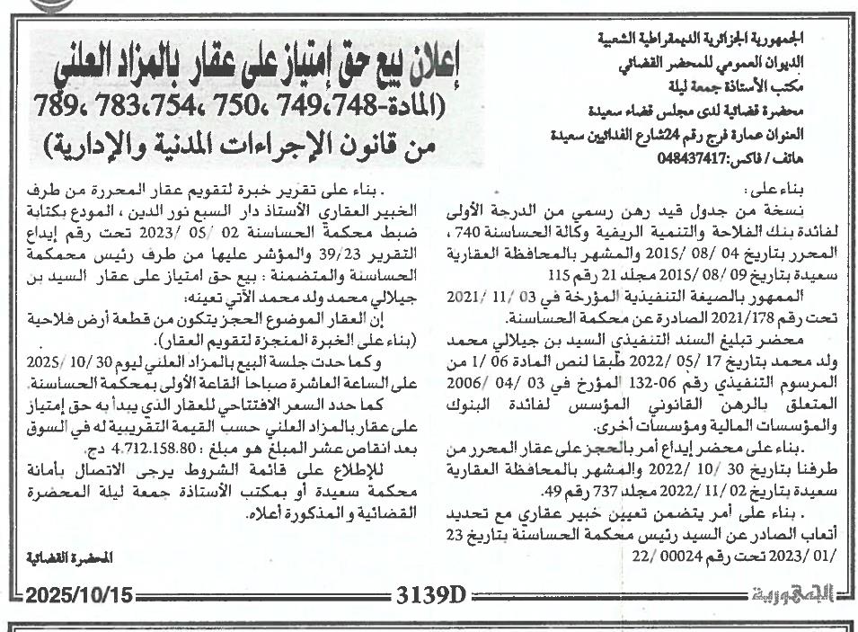 Il sera procédé à la vente au plus offrant et dernier enchérisseur le : 30/10/2025';