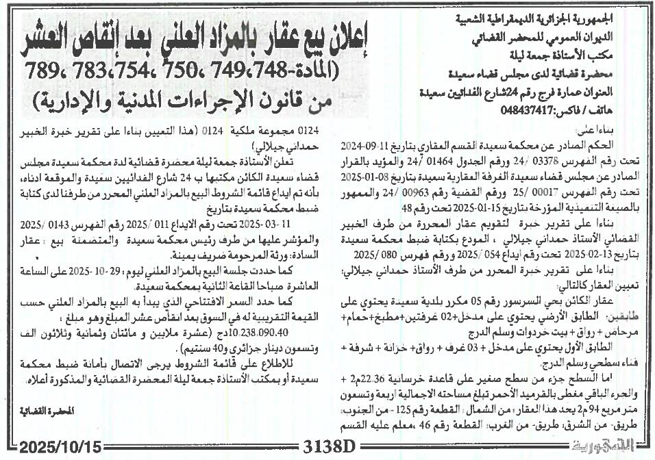 Il sera procédé à la vente au plus offrant et dernier enchérisseur le :
