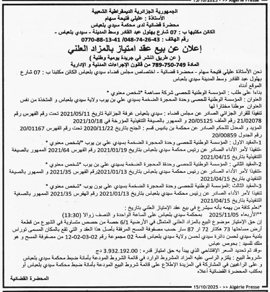 Il sera procédé à la vente au plus offrant et dernier enchérisseur le :