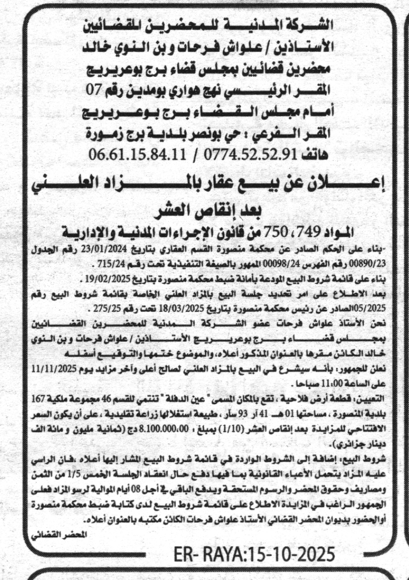 Il sera procédé à la vente au plus offrant et dernier enchérisseur le : 22/10/2025';