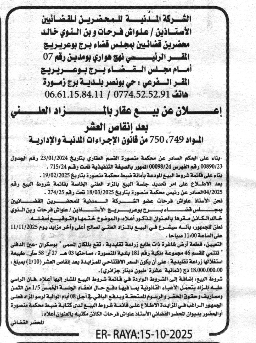 Il sera procédé à la vente au plus offrant et dernier enchérisseur le : 22/10/2025';