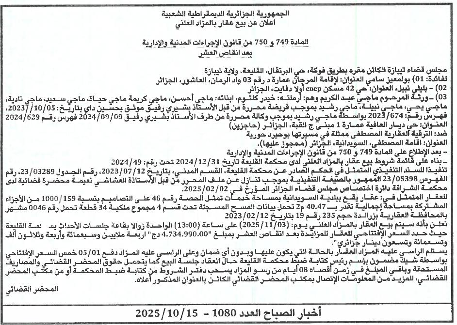 Il sera procédé à la vente au plus offrant et dernier enchérisseur le :