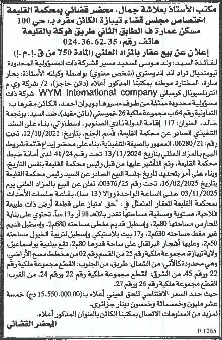 Il sera procédé à la vente au plus offrant et dernier enchérisseur le :