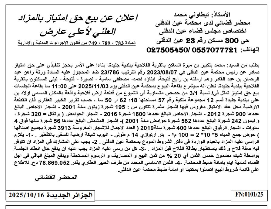 Il sera procédé à la vente au plus offrant et dernier enchérisseur le :