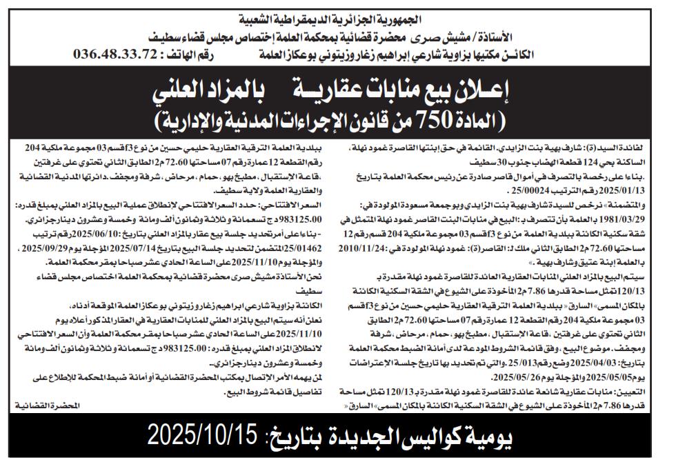 Il sera procédé à la vente au plus offrant et dernier enchérisseur le :