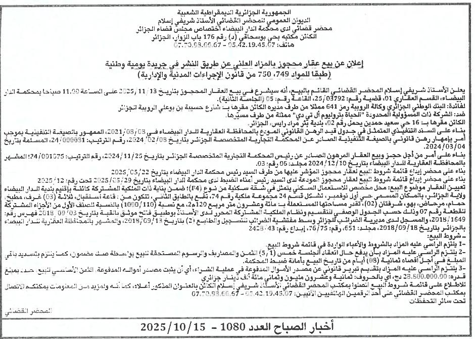 Il sera procédé à la vente au plus offrant et dernier enchérisseur le :