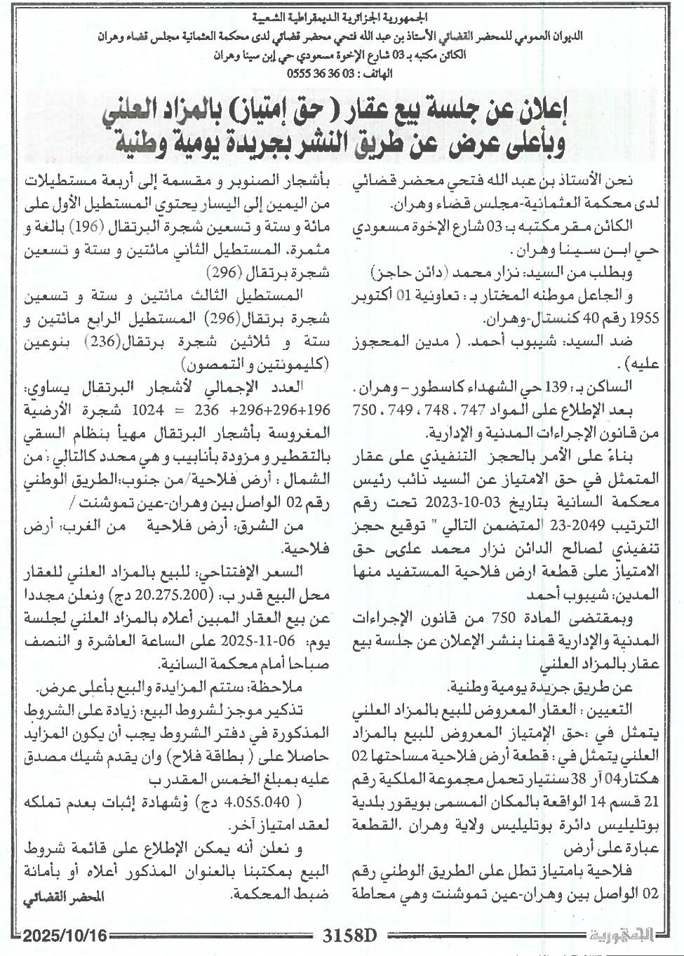 Il sera procédé à la vente au plus offrant et dernier enchérisseur le :