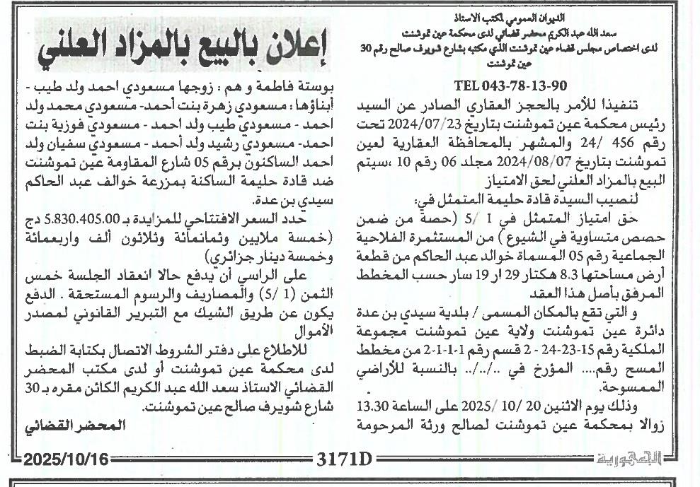 Il sera procédé à la vente au plus offrant et dernier enchérisseur le : 20/10/2025';