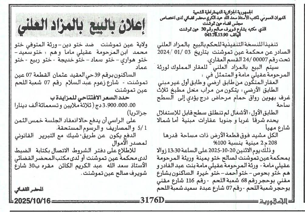 Il sera procédé à la vente au plus offrant et dernier enchérisseur le : 20/10/2025';