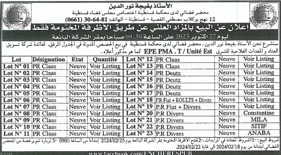 | Objet: Vente de matériels agricoles. | |