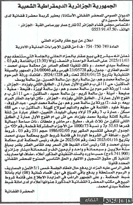 Il sera procédé à la vente au plus offrant et dernier enchérisseur le :