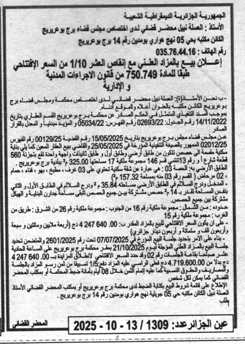 Il sera procédé à la vente au plus offrant et dernier enchérisseur le : 20/10/2025';