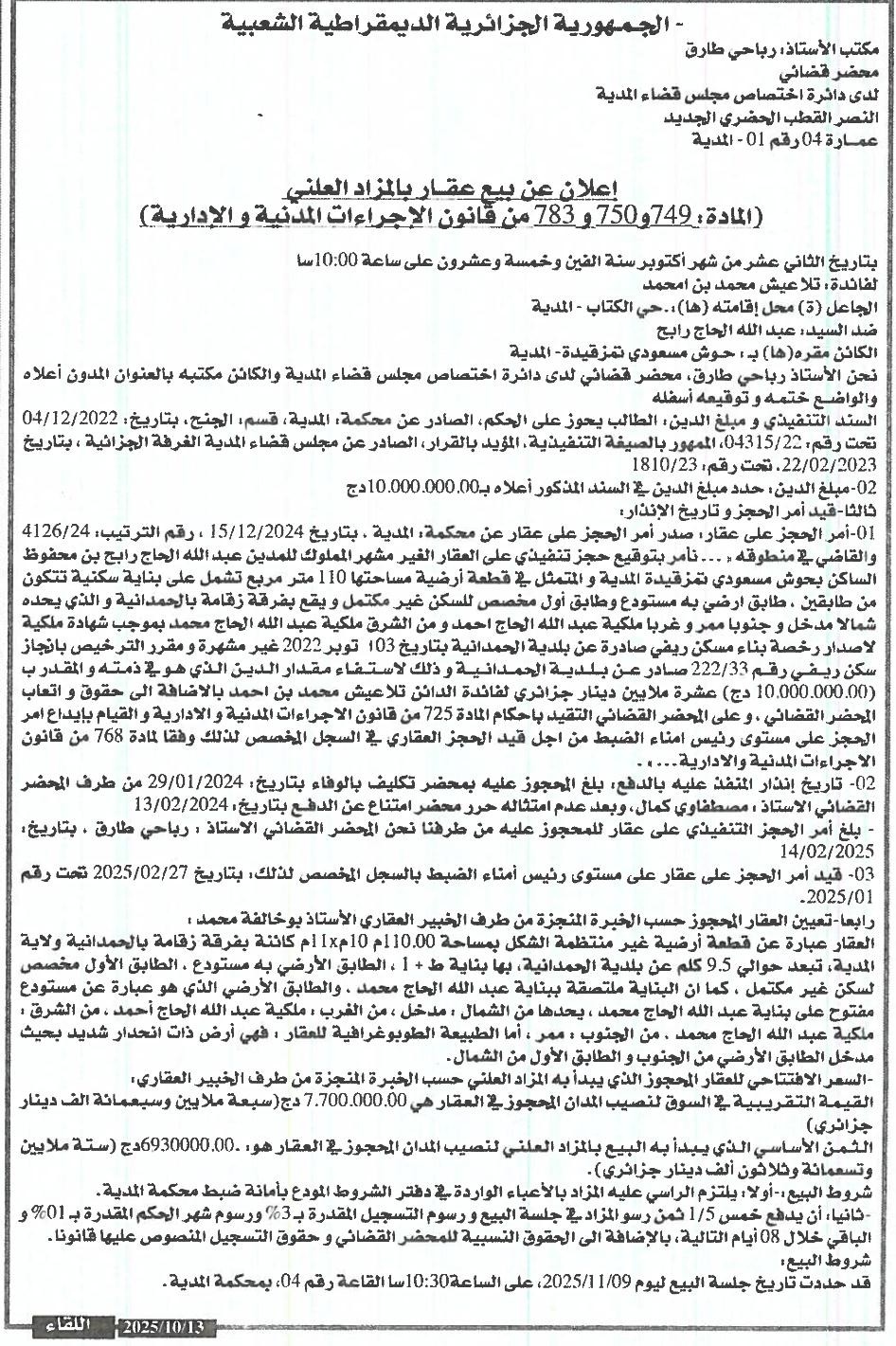 Il sera procédé à la vente au plus offrant et dernier enchérisseur le :