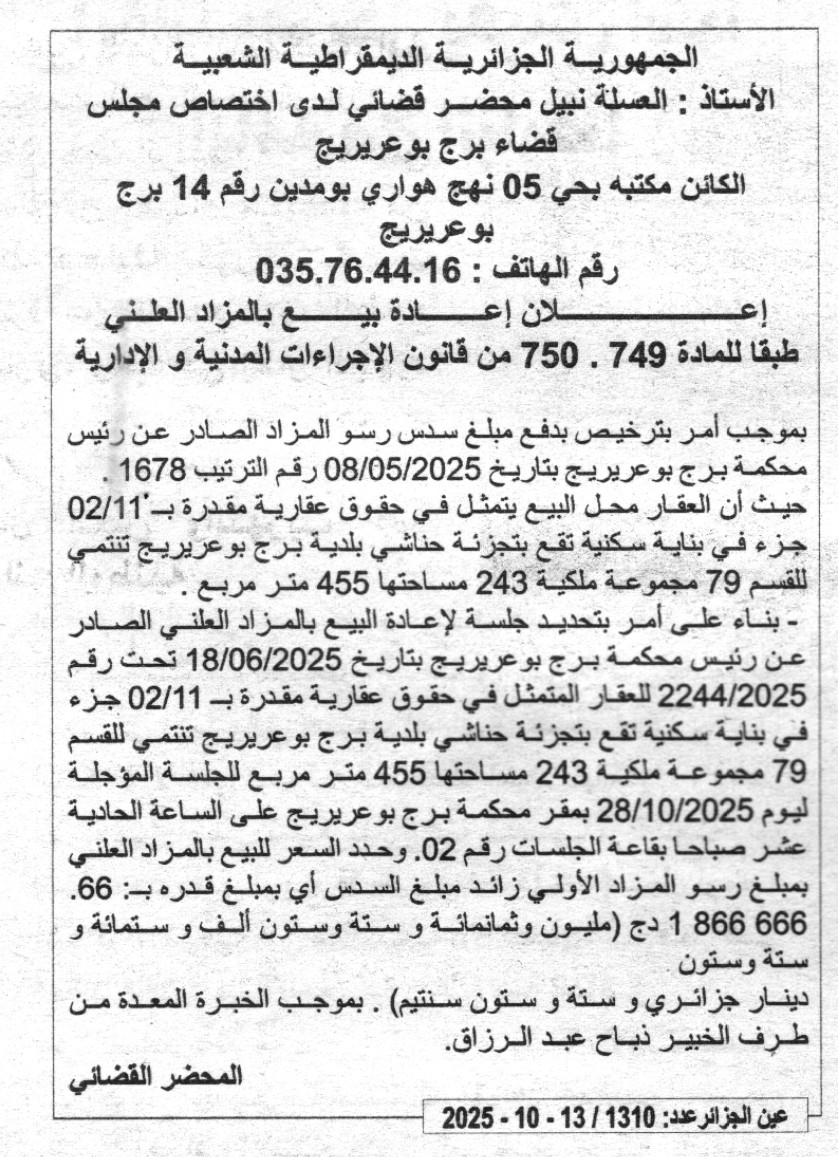 Il sera procédé à la vente au plus offrant et dernier enchérisseur le : 28/10/2025';