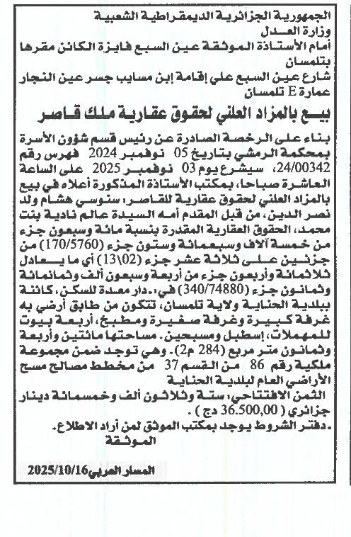 Il sera procédé à la vente au plus offrant et dernier enchérisseur le :