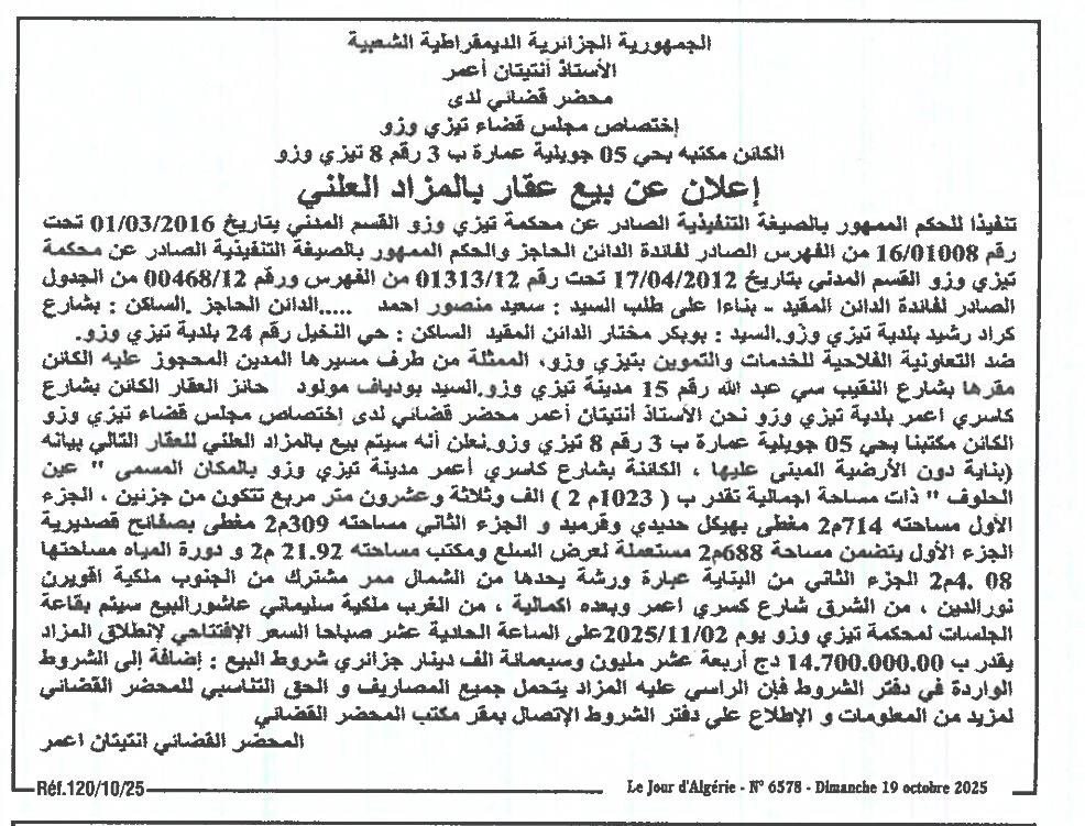 Il sera procédé à la vente au plus offrant et dernier enchérisseur le :