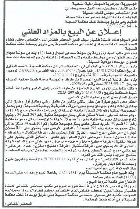 Il sera procédé à la vente au plus offrant et dernier enchérisseur le :