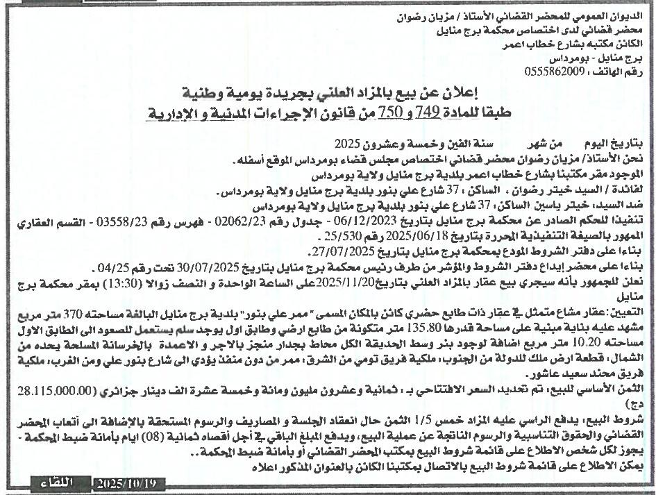 Il sera procédé à la vente au plus offrant et dernier enchérisseur le :