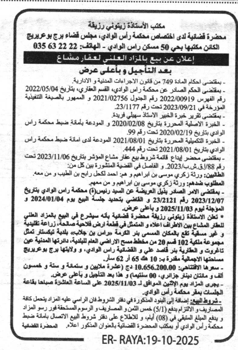 Il sera procédé à la vente au plus offrant et dernier enchérisseur le : 26/10/2025';