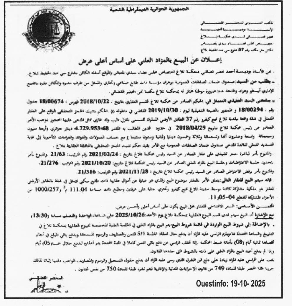 Il sera procédé à la vente au plus offrant et dernier enchérisseur le :