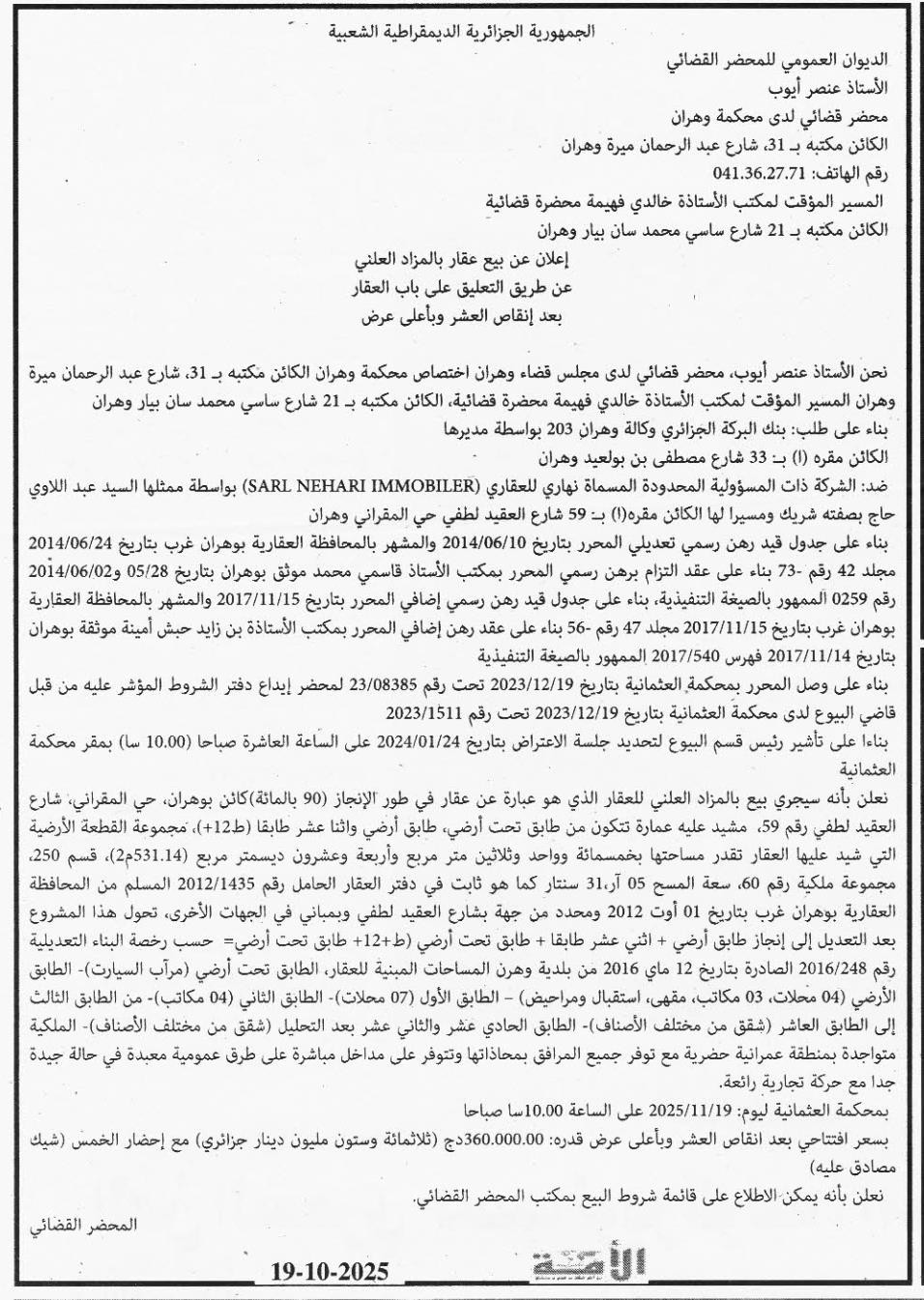 Il sera procédé à la vente au plus offrant et dernier enchérisseur le :