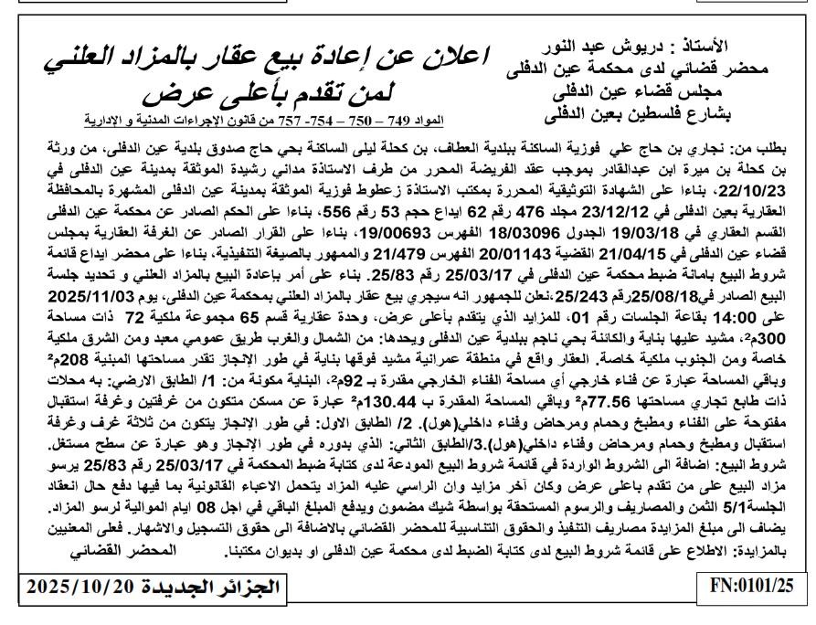 Il sera procédé à la vente au plus offrant et dernier enchérisseur le :