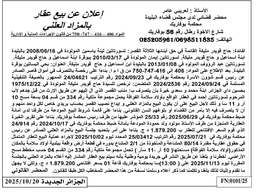 Il sera procédé à la vente au plus offrant et dernier enchérisseur le : 27/10/2025';