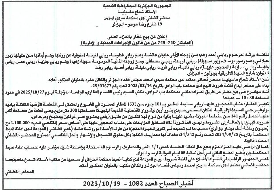 Il sera procédé à la vente au plus offrant et dernier enchérisseur le :