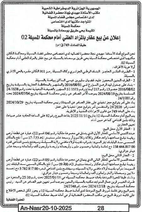 Il sera procédé à la vente au plus offrant et dernier enchérisseur le :