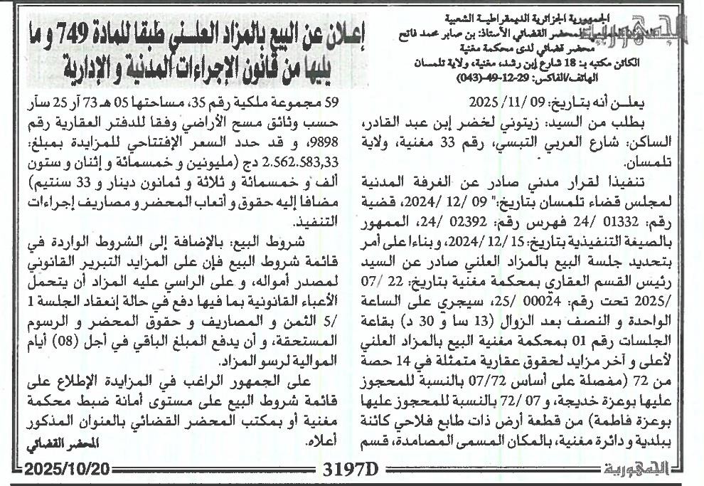 Il sera procédé à la vente au plus offrant et dernier enchérisseur le : 27/10/2025';