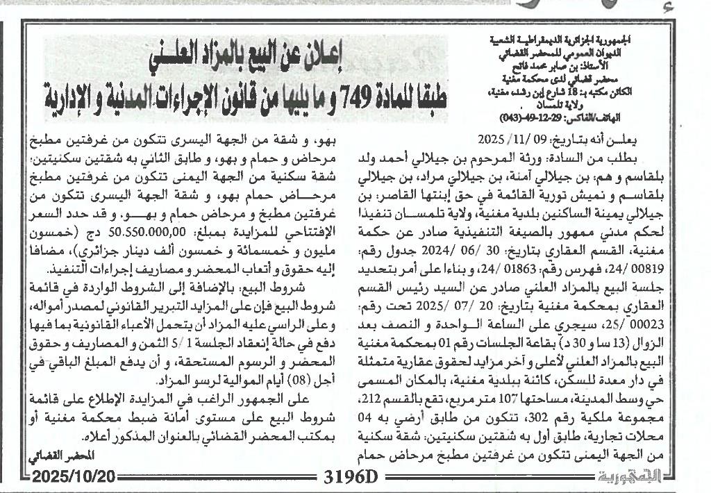 Il sera procédé à la vente au plus offrant et dernier enchérisseur le : 27/10/2025';