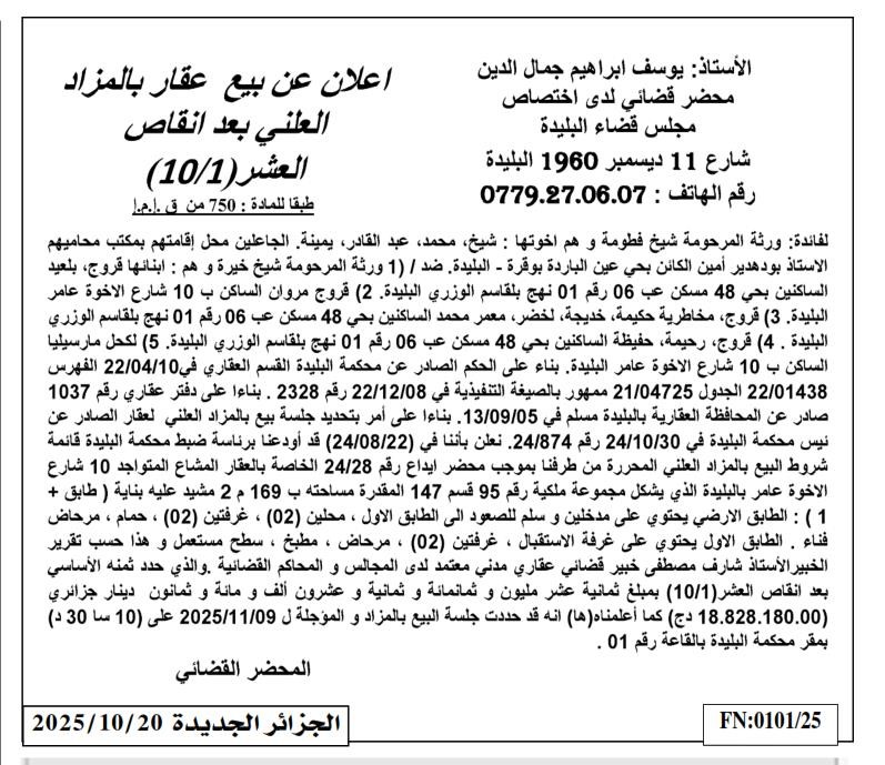 Il sera procédé à la vente au plus offrant et dernier enchérisseur le : 27/10/2025';