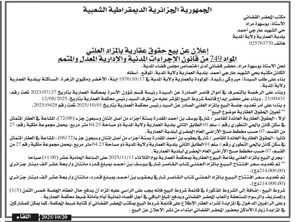 Il sera procédé à la vente au plus offrant et dernier enchérisseur le :