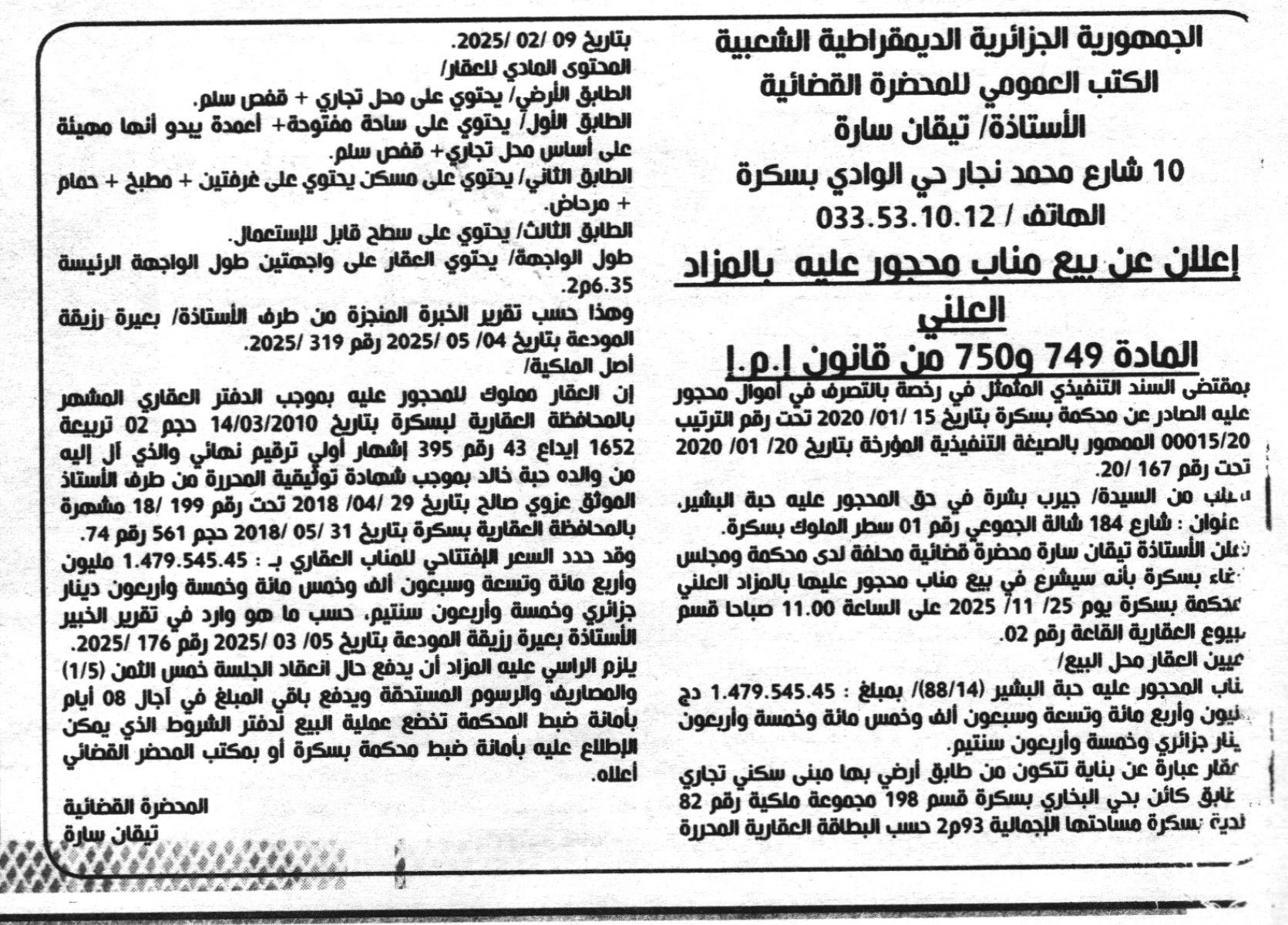 Il sera procédé à la vente au plus offrant et dernier enchérisseur le : 27/10/2025';